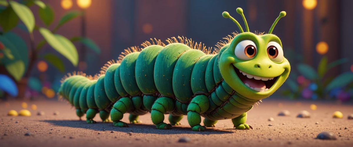 A 3D rendered image of a cheerful caterpillar with wide eyes and a beaming smile. The artwork is brightly colored with cinematic post-processing, reminiscent of Pixar or Disney concept art.
