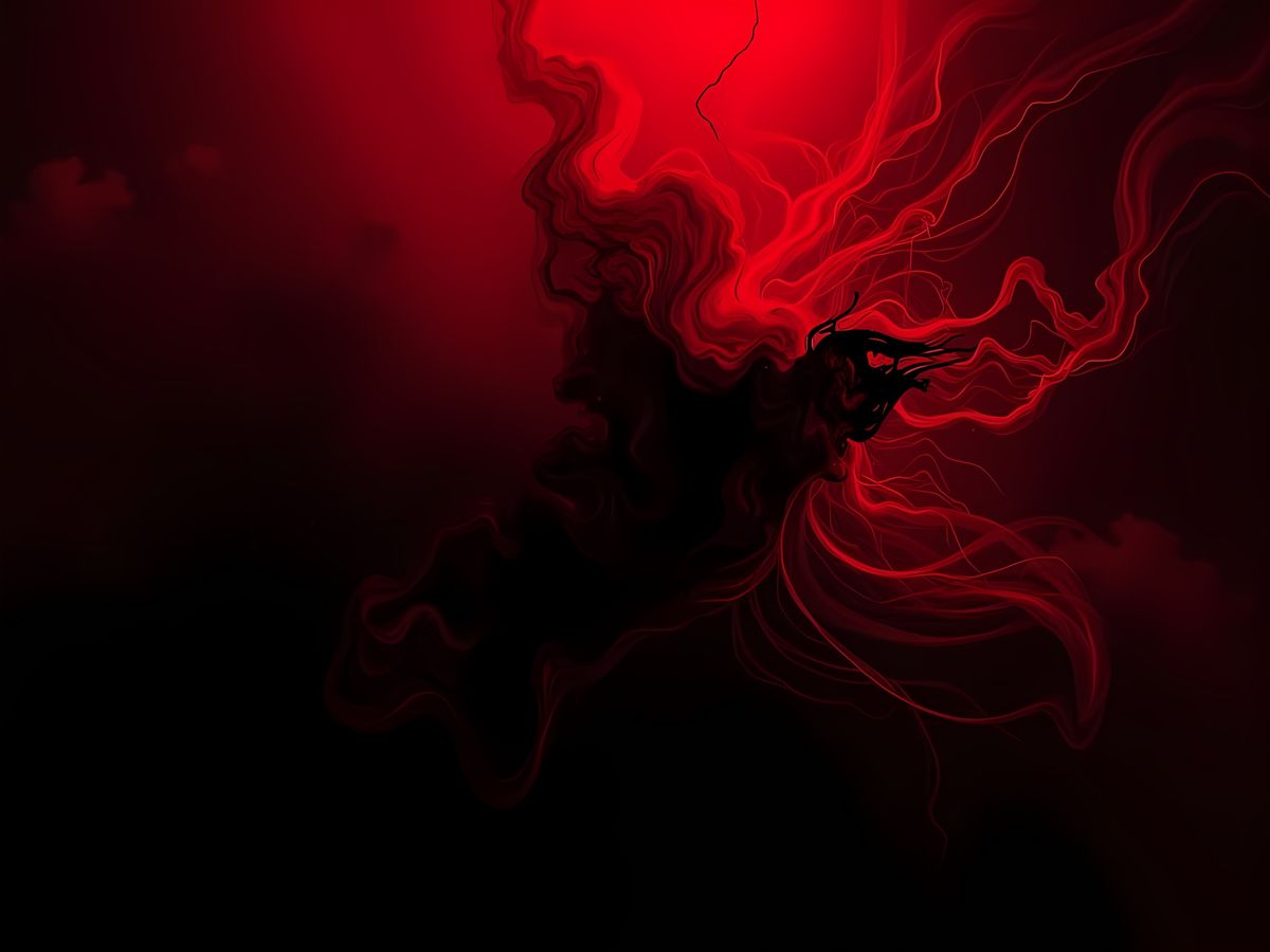 This image shows a dark, abstract composition with a red color scheme. The central area appears to be disintegrating into a void, creating a vaporizing effect.