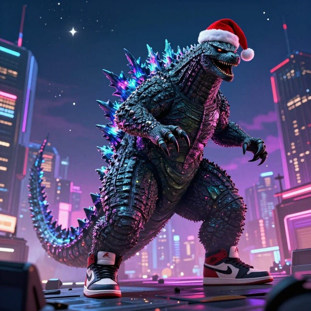 A hyperrealistic image of Godzilla in a Santa hat and sneakers, walking through a neon-lit futuristic city at night. Dramatic lighting and cinematic detail.