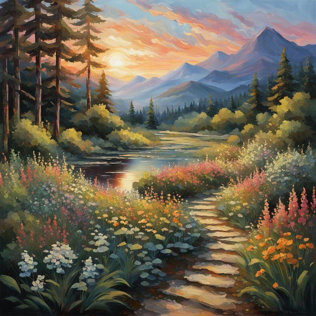 This image shows an impressionist style painting of a dense forest at sunset. A path leads to a pond, with mountains and wildflowers completing the tranquil scene.