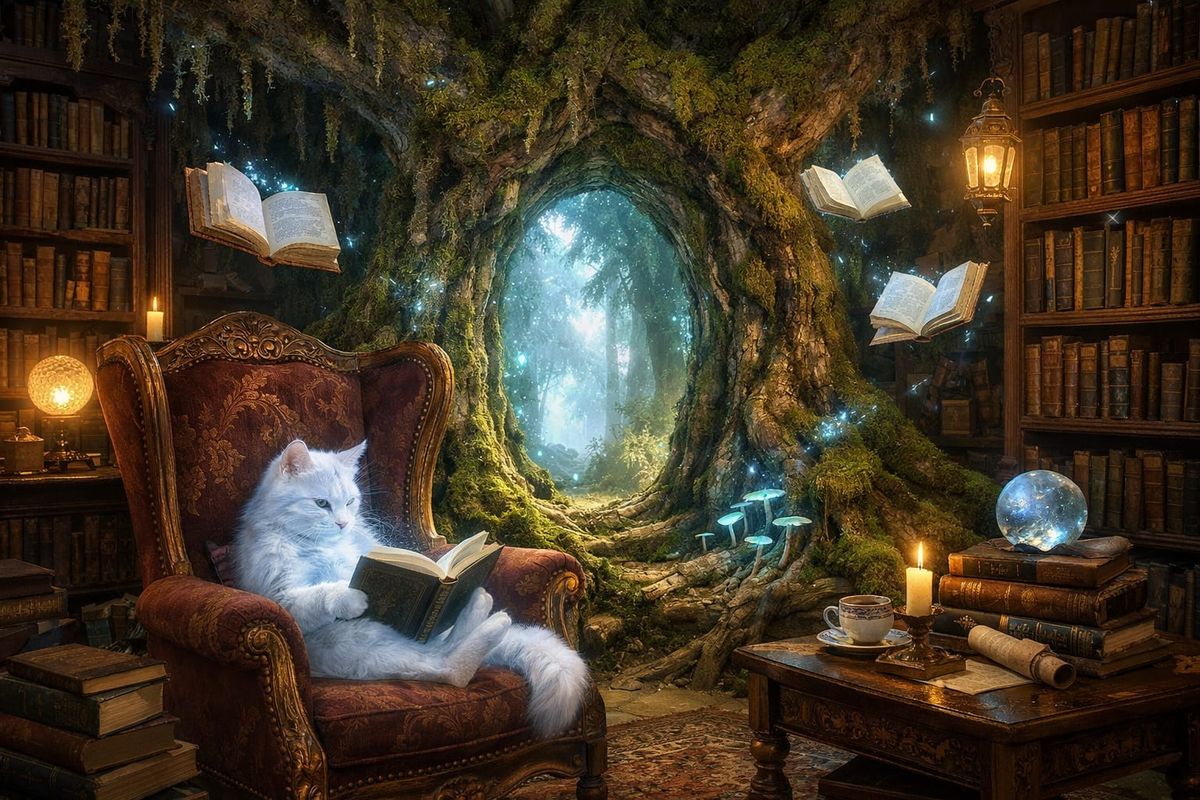 This image depicts a magical library reading space featuring ethereal books and a spectral cat. An ancient tree acts as a mystical portal, creating a tranquil, mythical ambiance with bioluminescent magic.