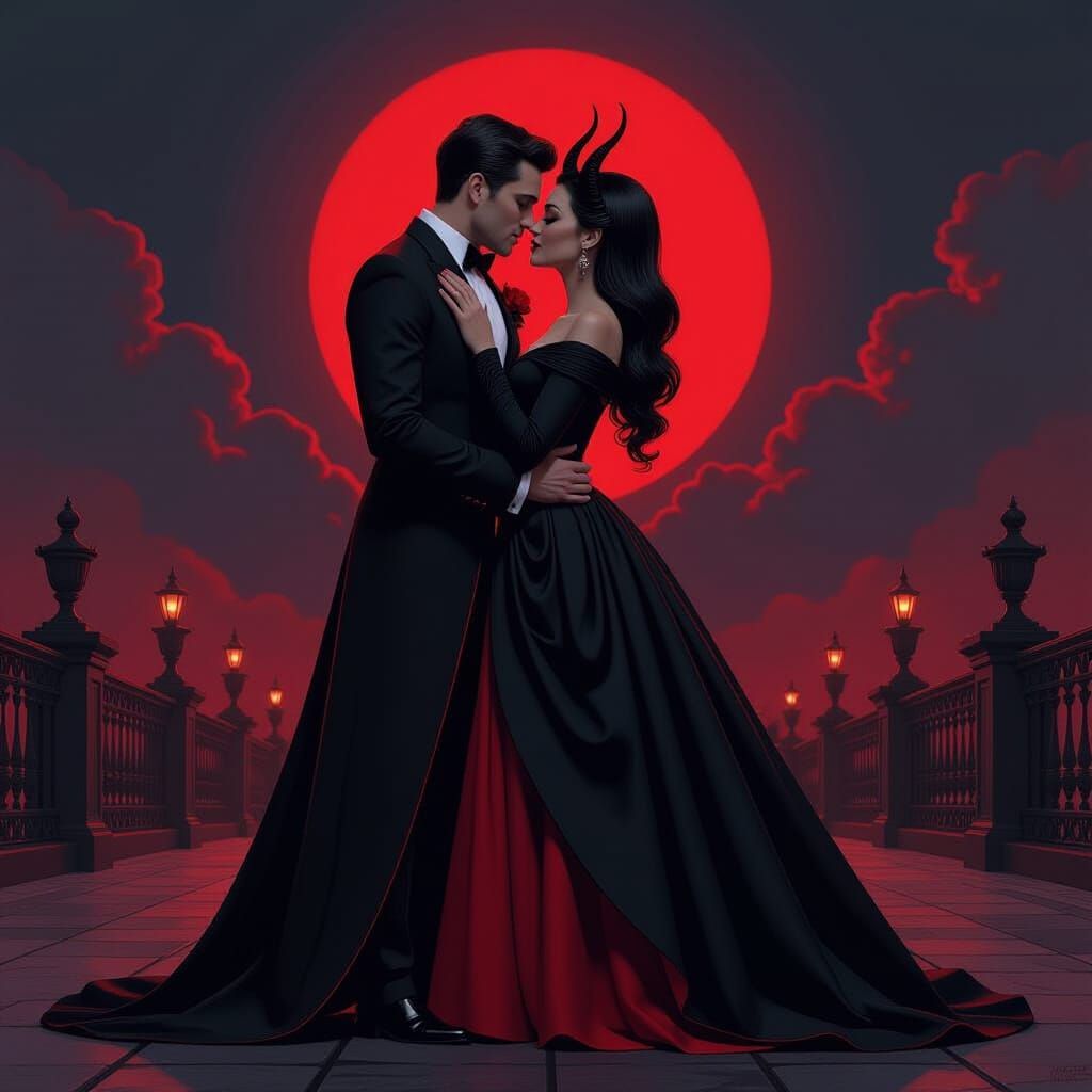 A striking picture of a couple in elaborate attire about to kiss in a dramatic pose. The scene, set against a dark background with red lighting, features a menacing figure lurking in the shadows, rendered with bold lines and vibrant colors.