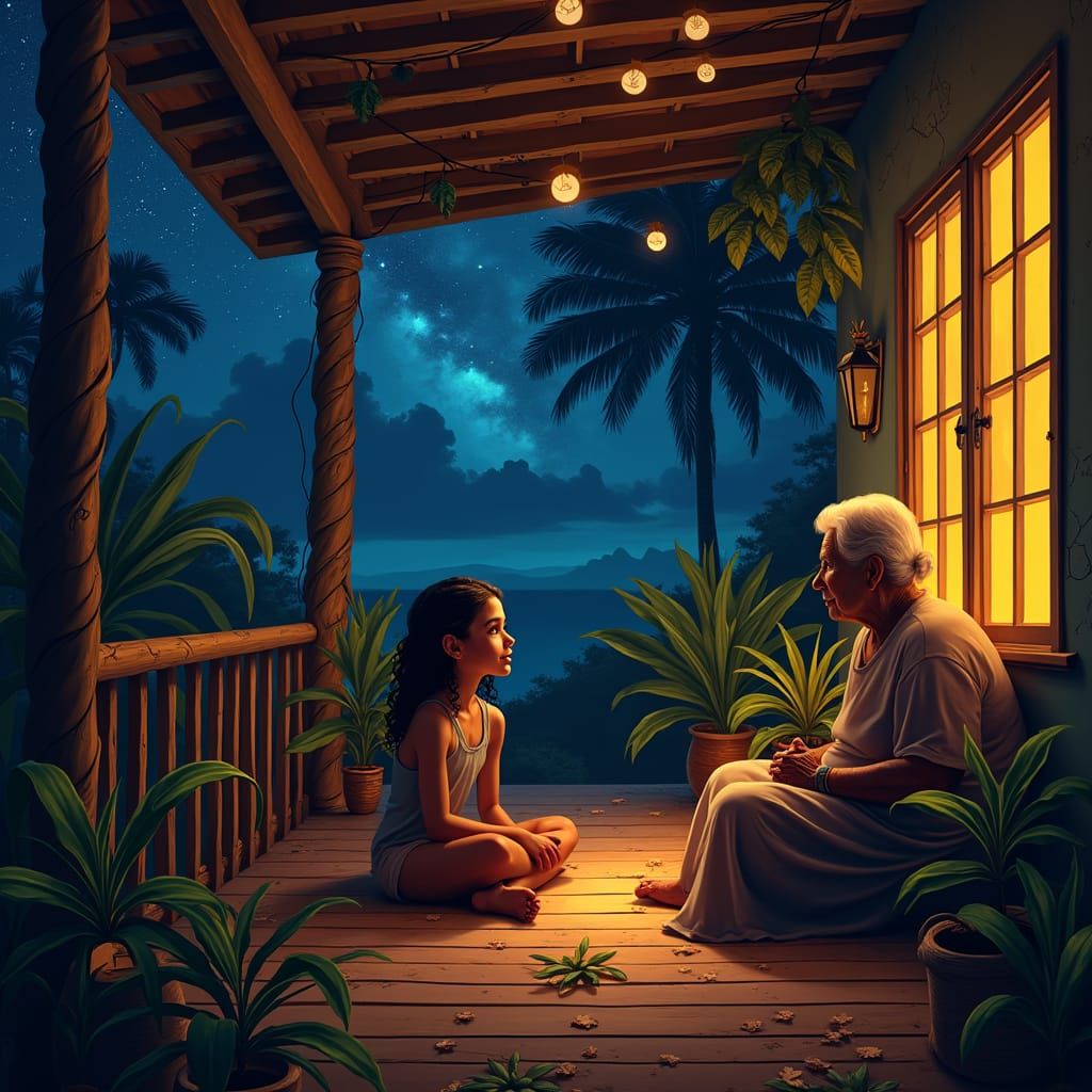 A warm, golden-lit porch in Puerto Rico, surrounded by lush tropical plants and mystical orbs, where a grandmother shares ancient secrets with her teenage granddaughter under a deep indigo night sky with twinkling stars.