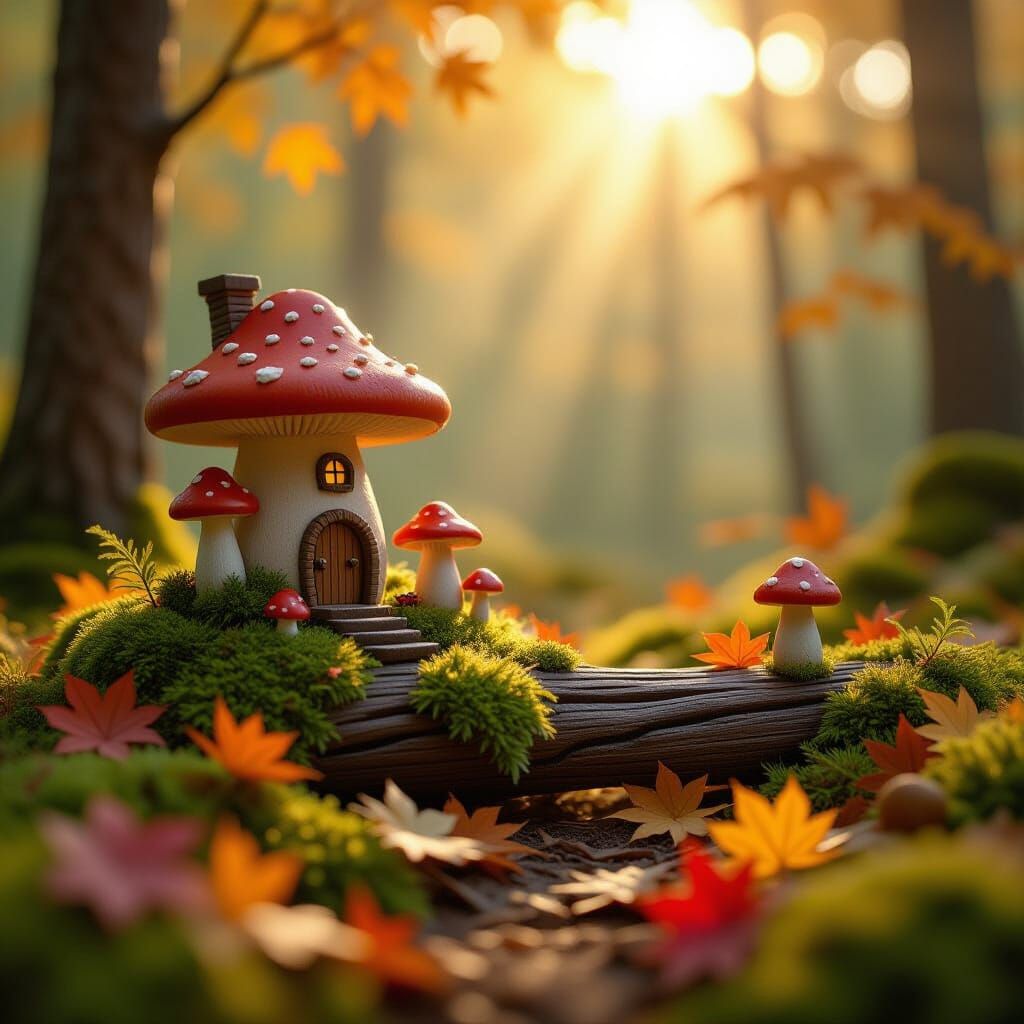 This image showcases a hyperrealistic miniature diorama of an autumnal forest. Tiny mushroom houses and mossy logs are detailed with vibrant fallen leaves, bathed in warm, dappled sunlight.
