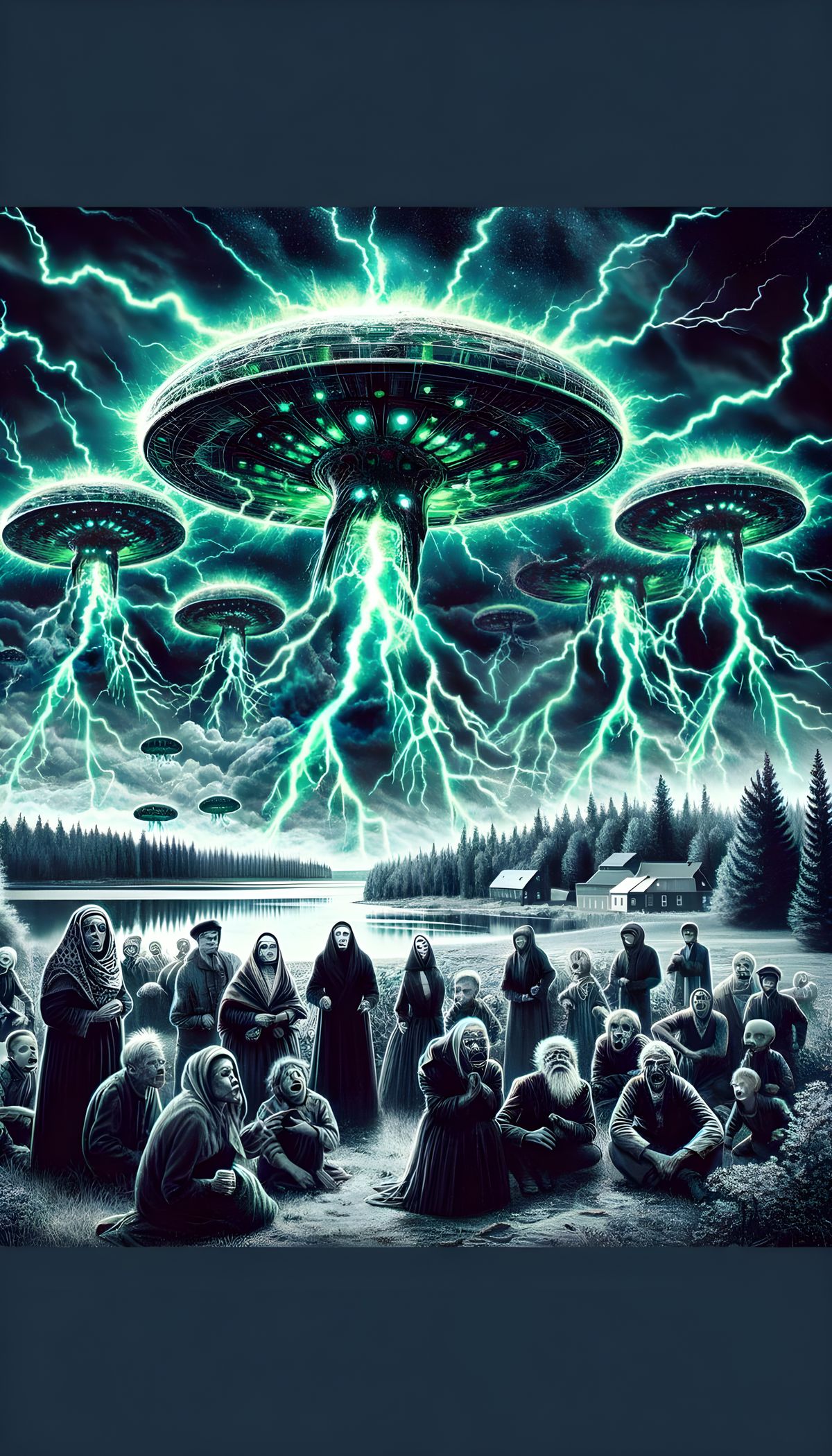 This image captures a surreal and intense scene of an alien invasion unfolding amidst a lightning storm over a Finnish landscape. The double exposure technique and cross-hatching style add a haunting quality to the scene, as people of diverse backgrounds witness the extraterrestrial event.
