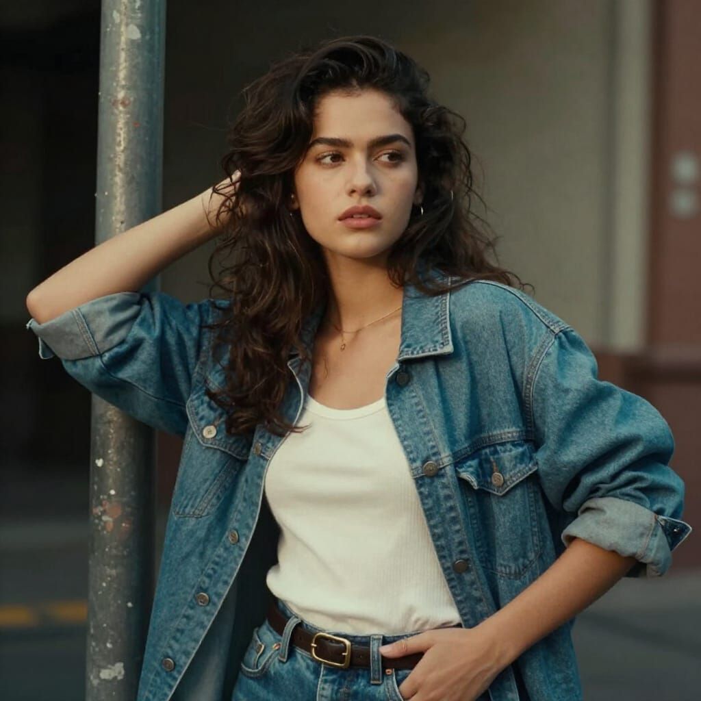 This image shows a young woman striking a realistic, natural fashion pose with an everyday look, perfect for social media. Cinematic lighting and film grain enhance the stunning visual.