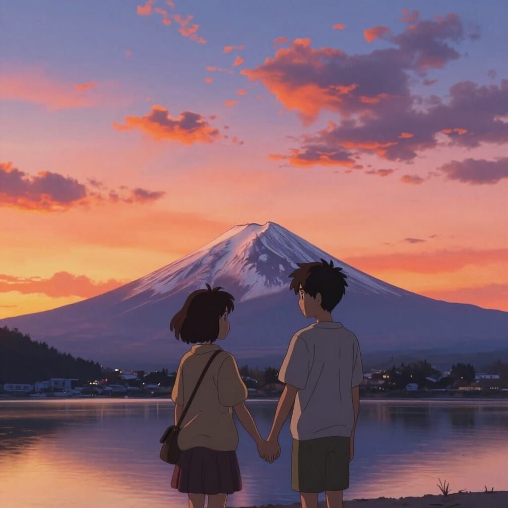 This image shows a young couple holding hands, silhouetted against a vibrant sunset over Fuji Five Lakes. The art style resembles detailed anime key visuals with atmospheric lighting.