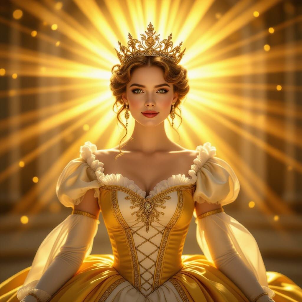 This image shows a majestic Victorian queen bathed in golden hour light. Beams of light radiate around her, enhanced by cinematic lighting and a subtle lens flare for a regal aura.