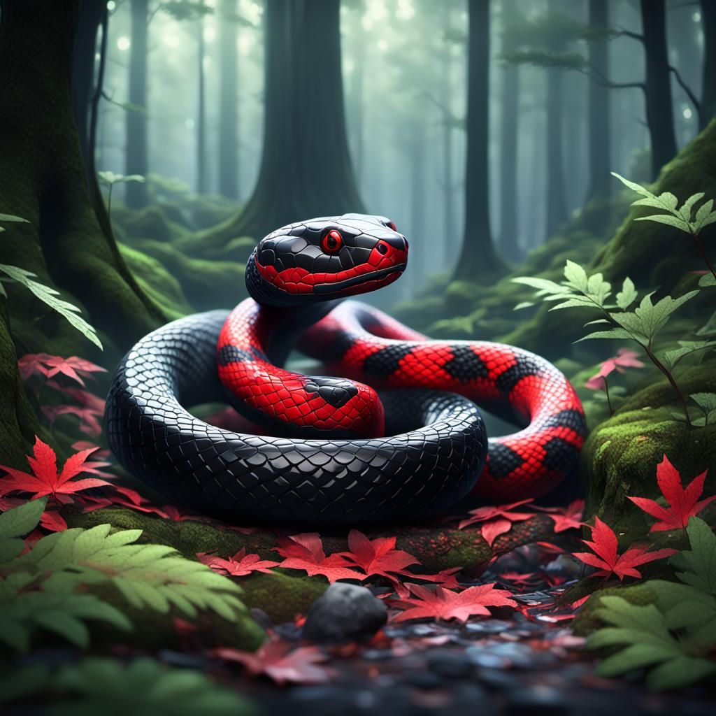 This image shows a black and red snake in a forest, caught in a moment of uncertainty. The vibrant 3D anime art features cinematic lighting and intricate details, rendered with atmospheric perspective.
