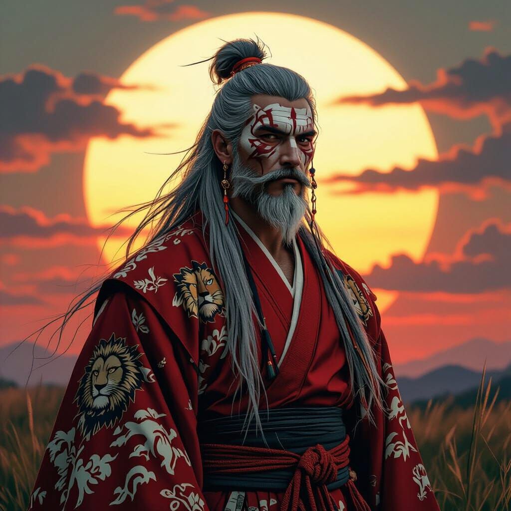 This image shows a muscular man with long gray hair and vitiligo, dressed in red Shogun-style robes and a lion headdress, standing on a grassy plain in a vibrant, cinematic digital painting.