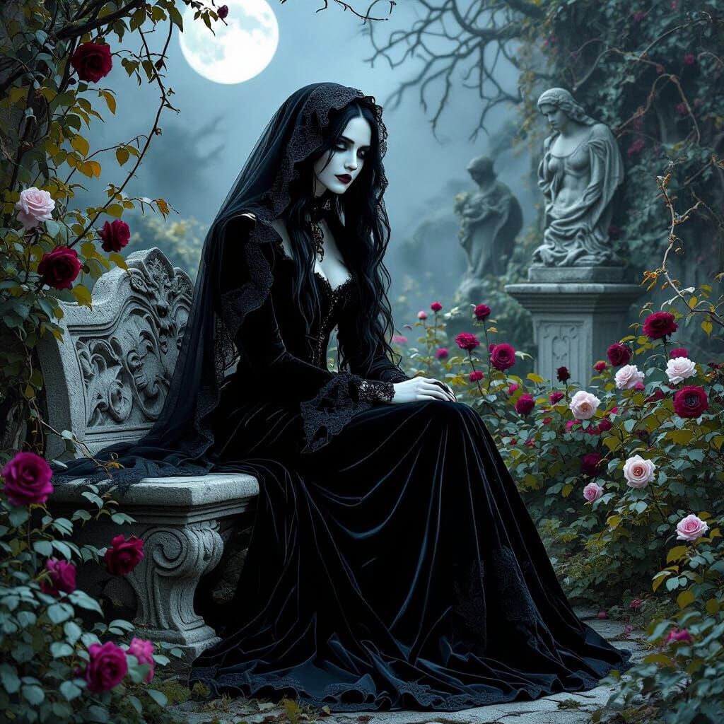 A hyperrealistic image of a sorrowful gothic woman in a black velvet gown sitting on a stone bench in a moonlit garden. Overgrown roses, thorny vines and fog shrouded statues surround her, evoking gothic romance.