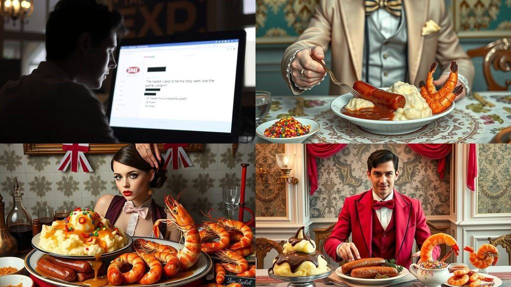 This image depicts a nude figure adorned with a variety of colorful foods, including creamy mash potatoes, juicy sausages, and rainbow confetti shrimps, all arranged in a Nyotaimori-inspired style, evoking a sense of British sitophilia and food play love.