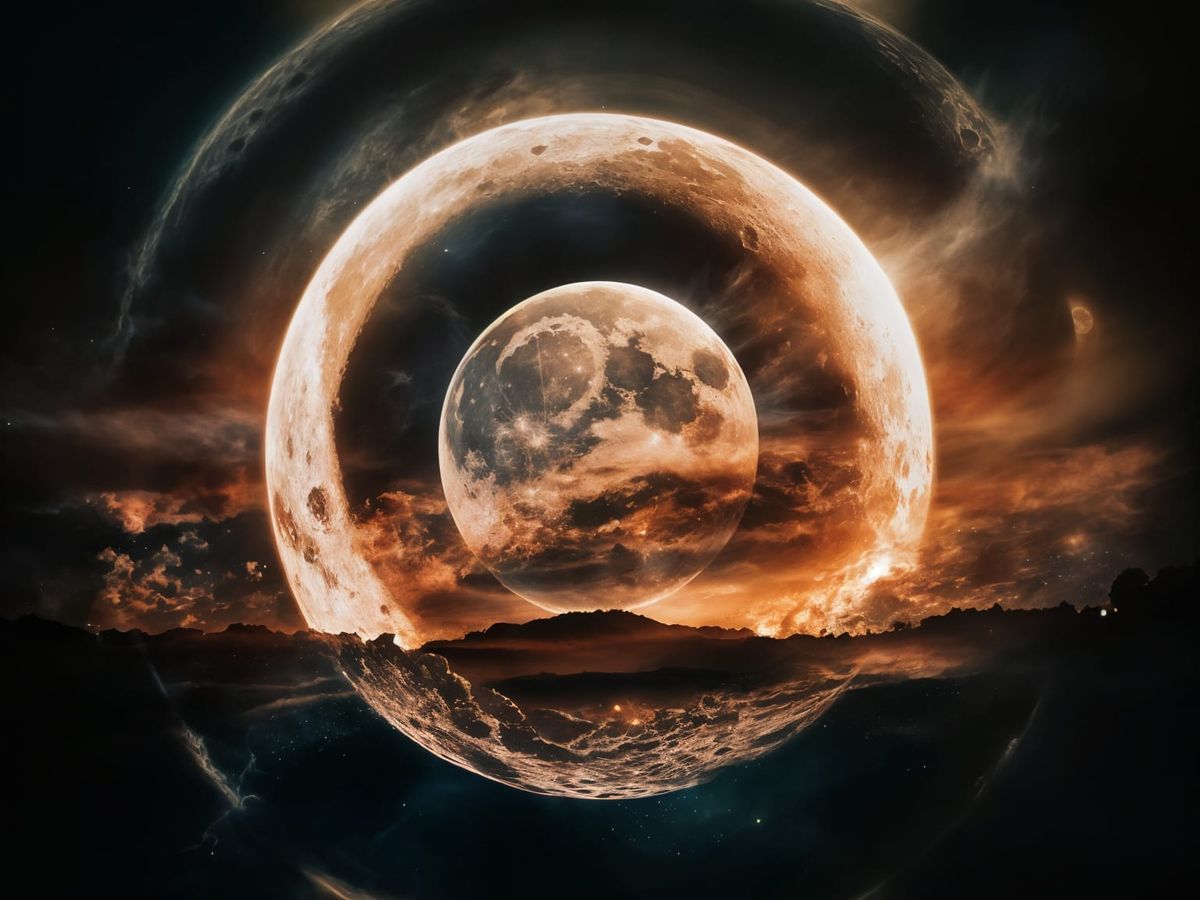A striking double exposure image of a cosmic landscape beneath a bright moon. The art features ethereal rhythms and layered lunar cycles, creating a dark, mysterious, and beautiful scene.