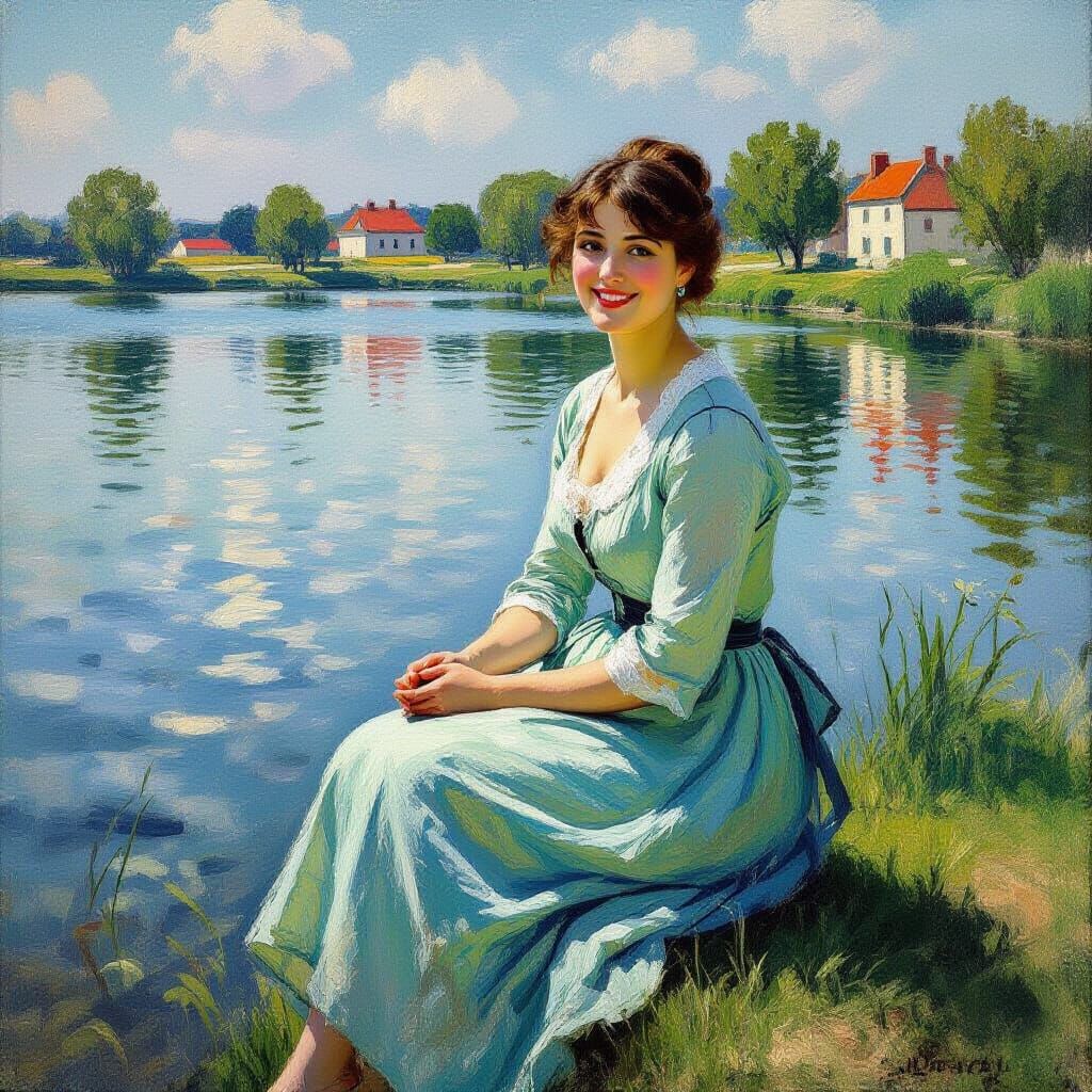 This image captures a smiling European woman in a light, seafoam green dress, seated serenely by a lake. The scene evokes a soft, pastel-hued Impressionist atmosphere.