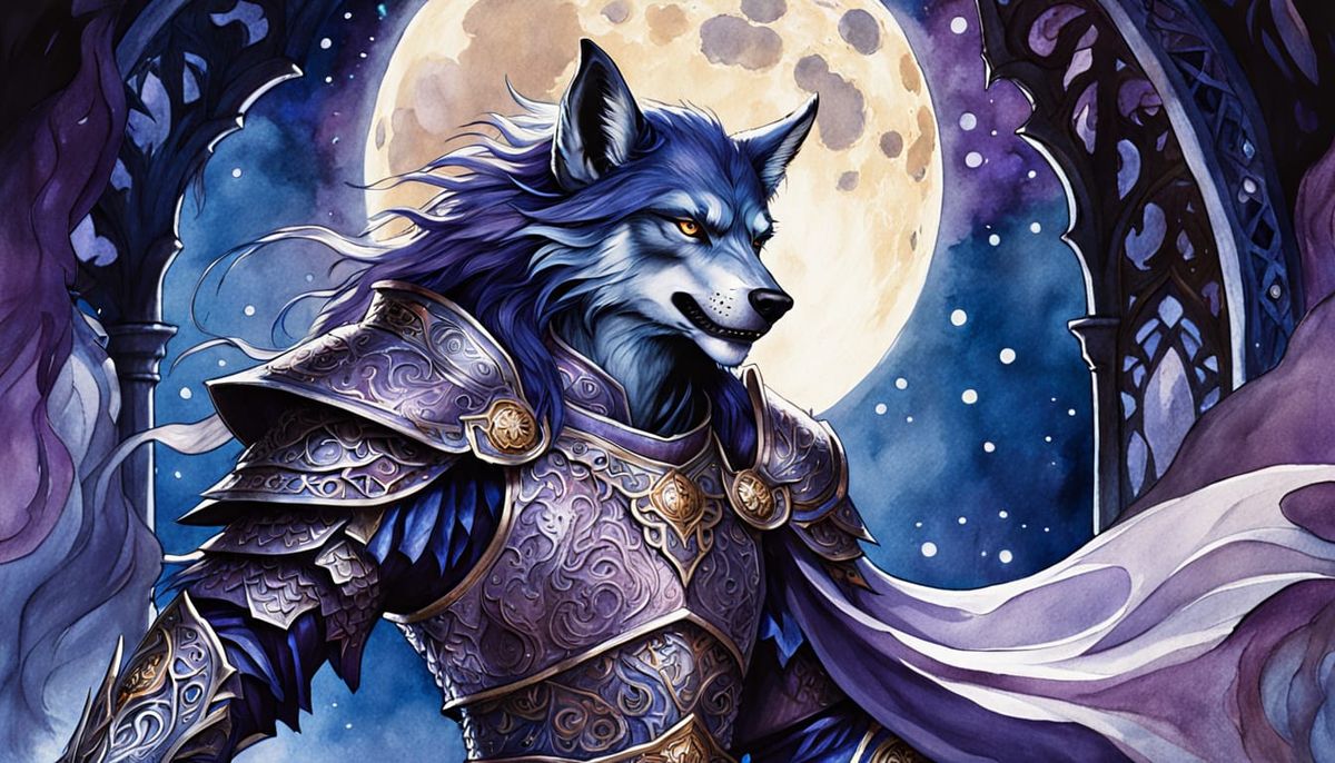 A striking picture of an elven werewolf howling at a lunar eclipse. The fantasy illustration features soft, ethereal lighting and deep blues and purples, reminiscent of art nouveau with alcohol ink.