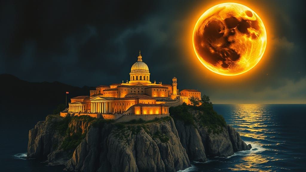 A glowing ancient city sits on a cliff under a golden moon. A butterfly double exposure is set against a solar eclipse in this ink painting with watercolor details.