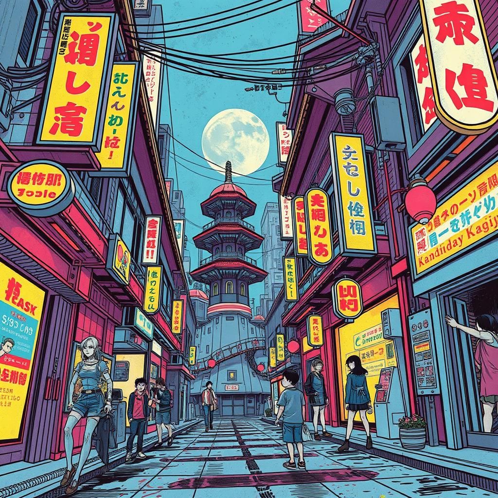 This image shows a manga scene set in a stylized and vibrant kanjuku environment. Traditional Japanese architecture is blended with futuristic elements in a neon-lit, retro-surreal aesthetic.