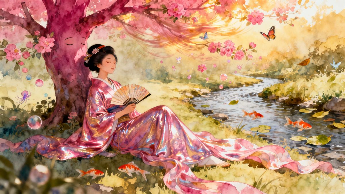 This image features a Japanese Geisha with eyes closed, elegantly dressed in a shiny silk kimono that drapes around her. She sits near a cerise pink tree with a gentle stream.