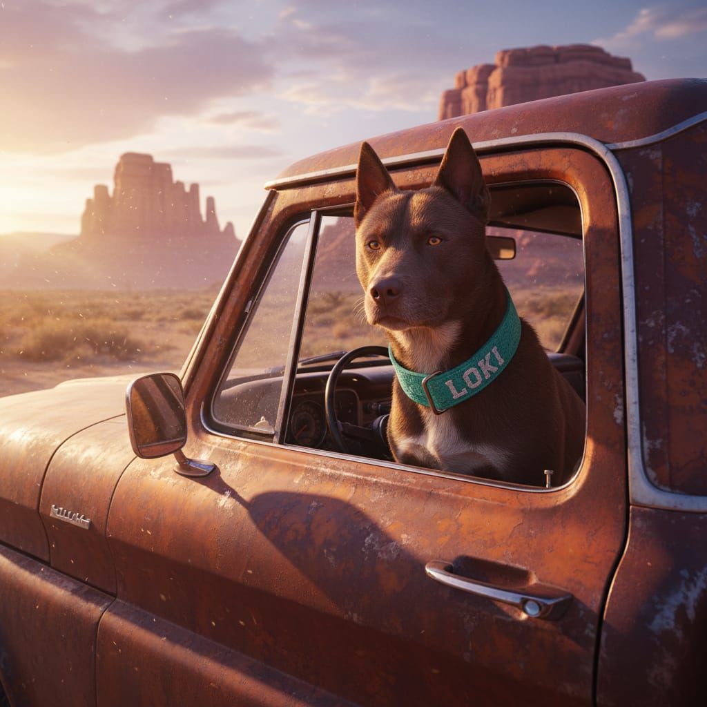 This image shows a chocolate Staffy husky mix with a teal collar in an old, oxidized truck. Rendered with epic 3D game cinematic quality and dynamic lighting.