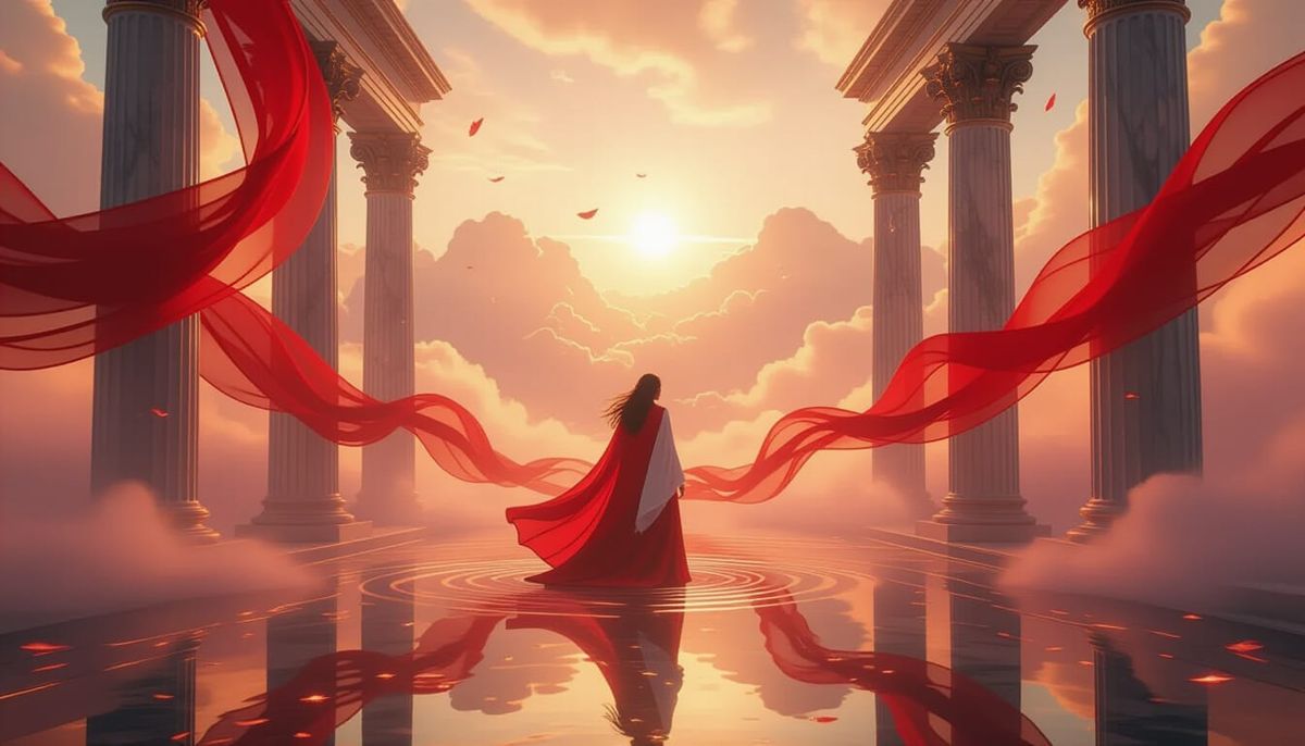This image depicts a dreamlike celestial fantasy with crimson mist and red light ribbons around marble columns. A lone figure stands in a warm glow, with iridescent elements on a reflective ground. Rendered with ultra-soft bokeh and painterly detail.