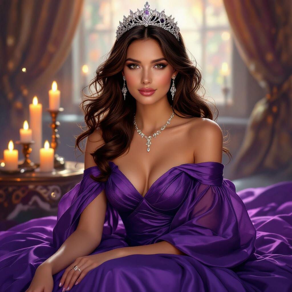 A striking picture of a brunette woman in a purple gown and tiara, surrounded by gems in a candlelit room. The image evokes an art nouveau aesthetic.