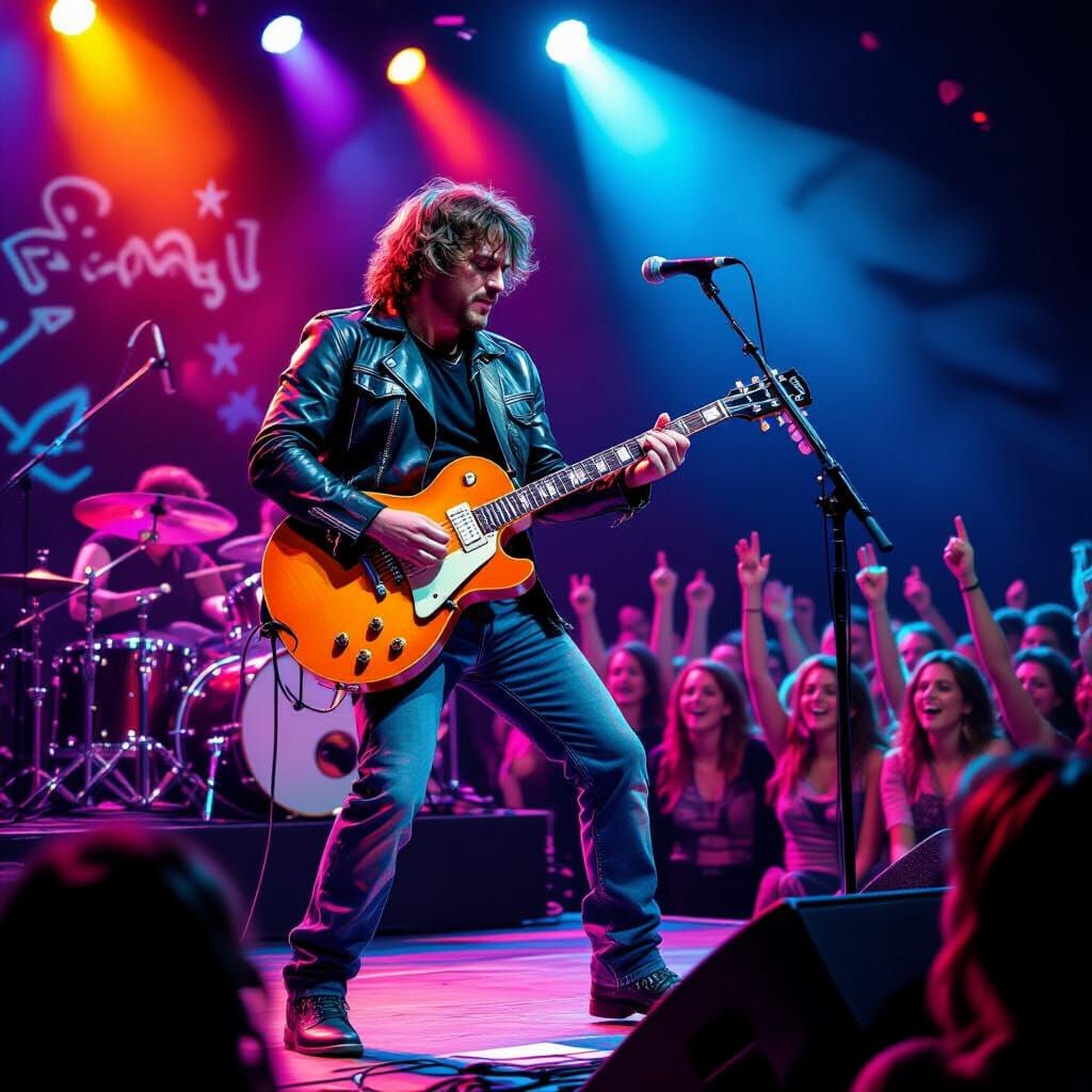 A musician plays guitar on a dimly lit stage in front of a cheering crowd. The image features vibrant colors and dynamic brushstrokes in a style reminiscent of street art.