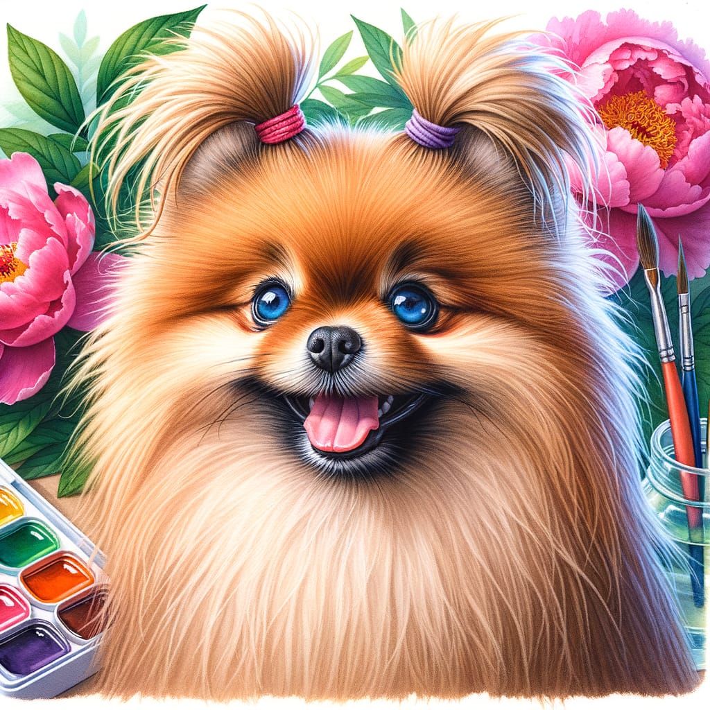 A detailed watercolor painting of a happy Pomeranian with a snub nose and shaggy fur. The dog's long hair is styled in ponytails, set against a vibrant peony background.
