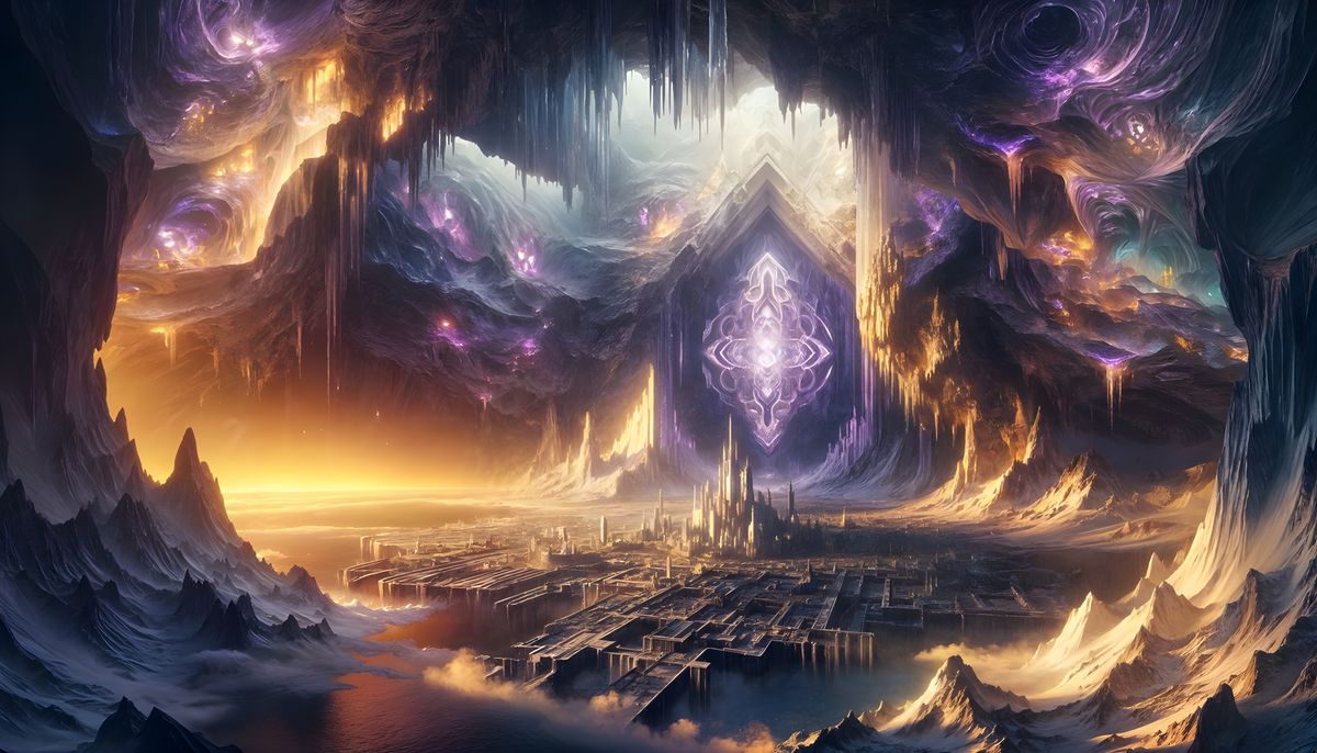 Imagine a vast cavern hidden beneath an expansive ice sheet. Nestled within this cavern is a city showcasing the marvels of ancient, yet advanced technology. The city is bathed in a soft, mesmerizing light that cascades down from a colossal crystal embedded in the cavern ceiling. Intricate mystical symbols, ...