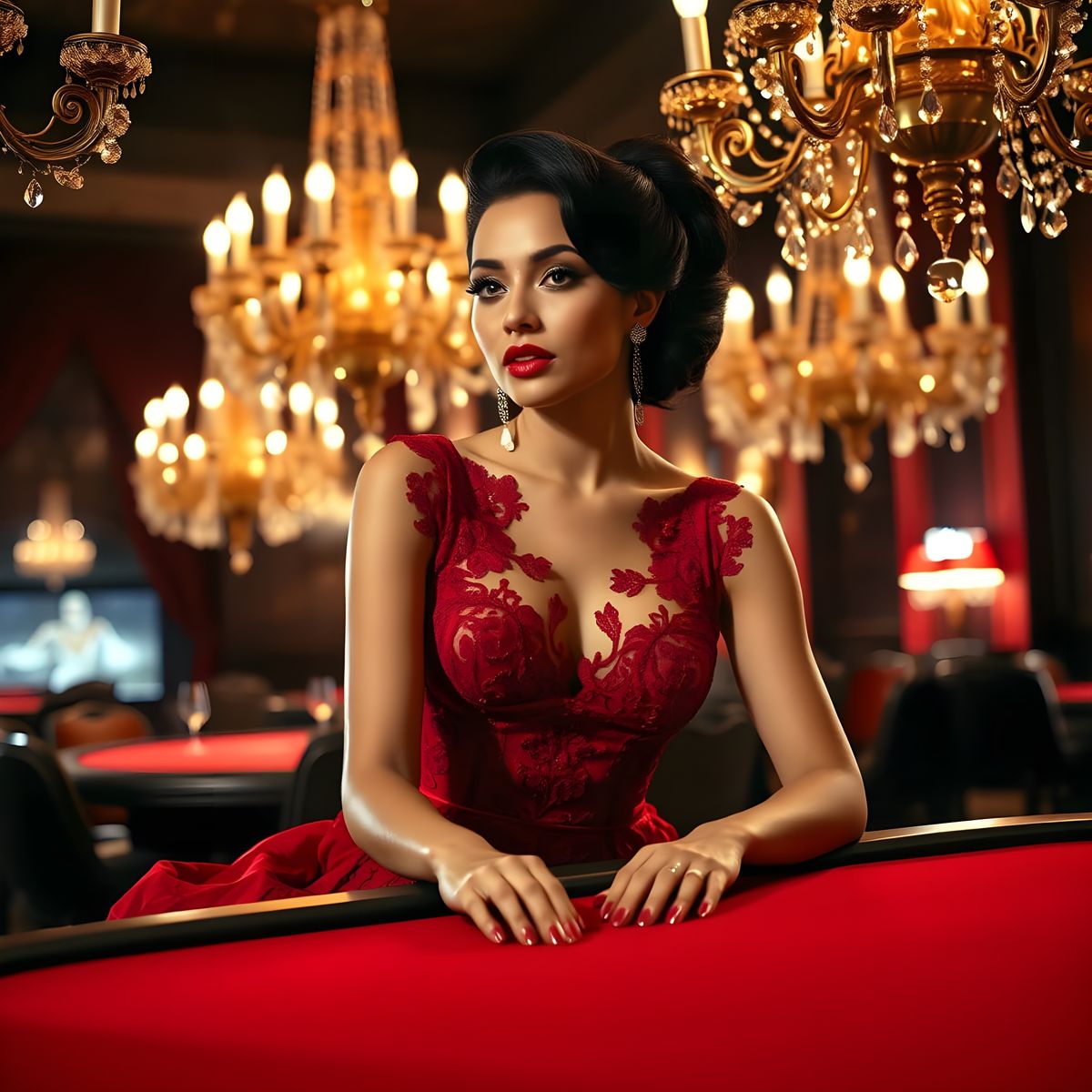 A captivating image of a Latina supermodel at a poker table. She's in a shimmering red gown, reminiscent of old Hollywood glamour. The scene is set in a luxurious casino with glittering chandeliers.