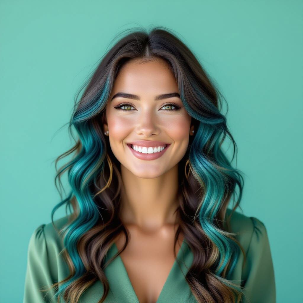 This image features a woman with long, wavy teal hair, wearing green and blue clothing against a background dominated by blue, teal, and green colors, emphasizing a cool palette.