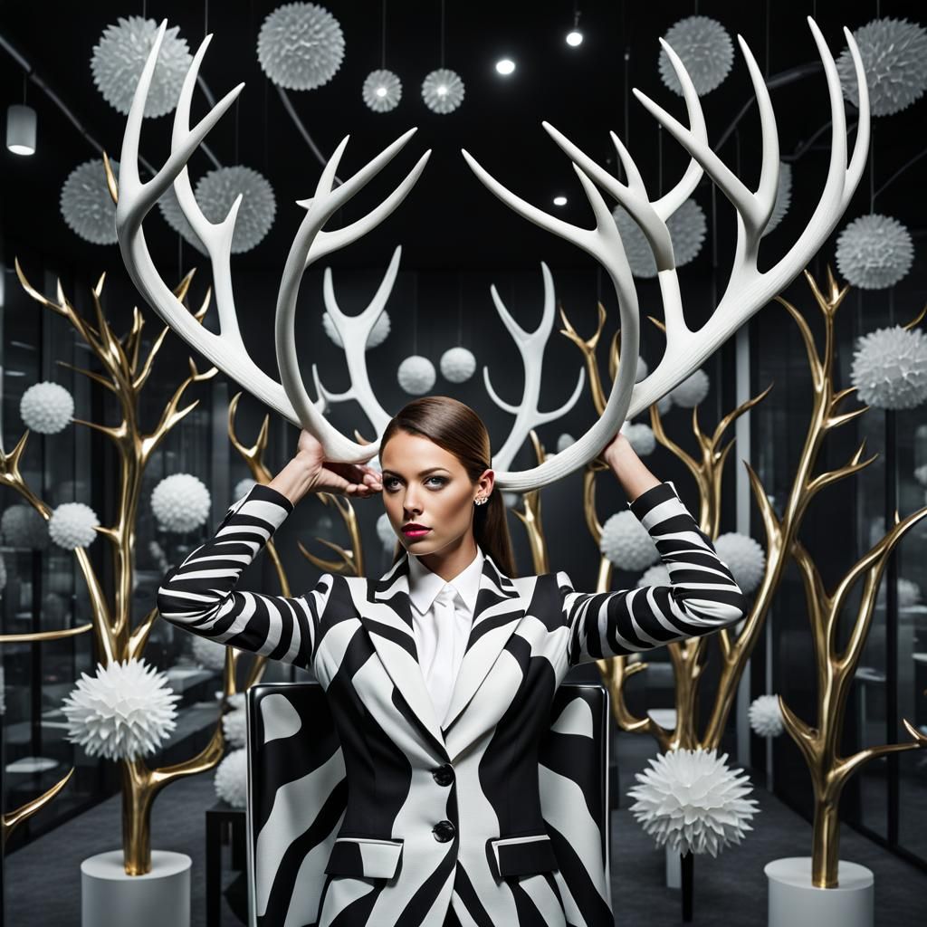 This image portrays a woman in a zebra-striped suit and antlers, set within a biomorphic office space. The scene is rendered with photorealistic detail.