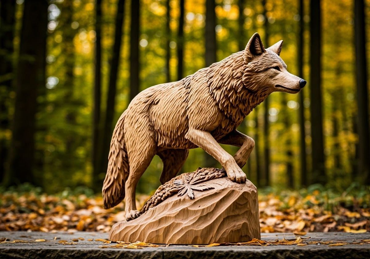 This image shows a detailed wood carving of a wolf in a forest setting. The wolf is captured in mid-motion, bathed in soft sunlight filtering through the autumn foliage.
