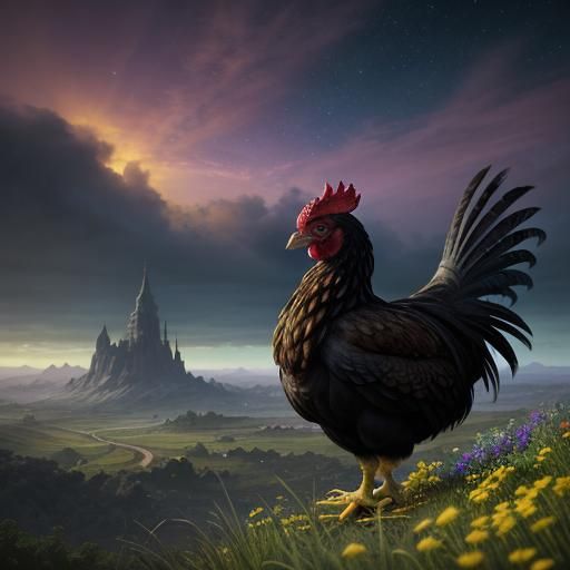 This image showcases a charming silkie chicken amidst a vibrant, colorful meadow. Rendered in a realistic matte painting style with cinematic realism, it features intricate details and sparkling colors under golden sunrise light.
