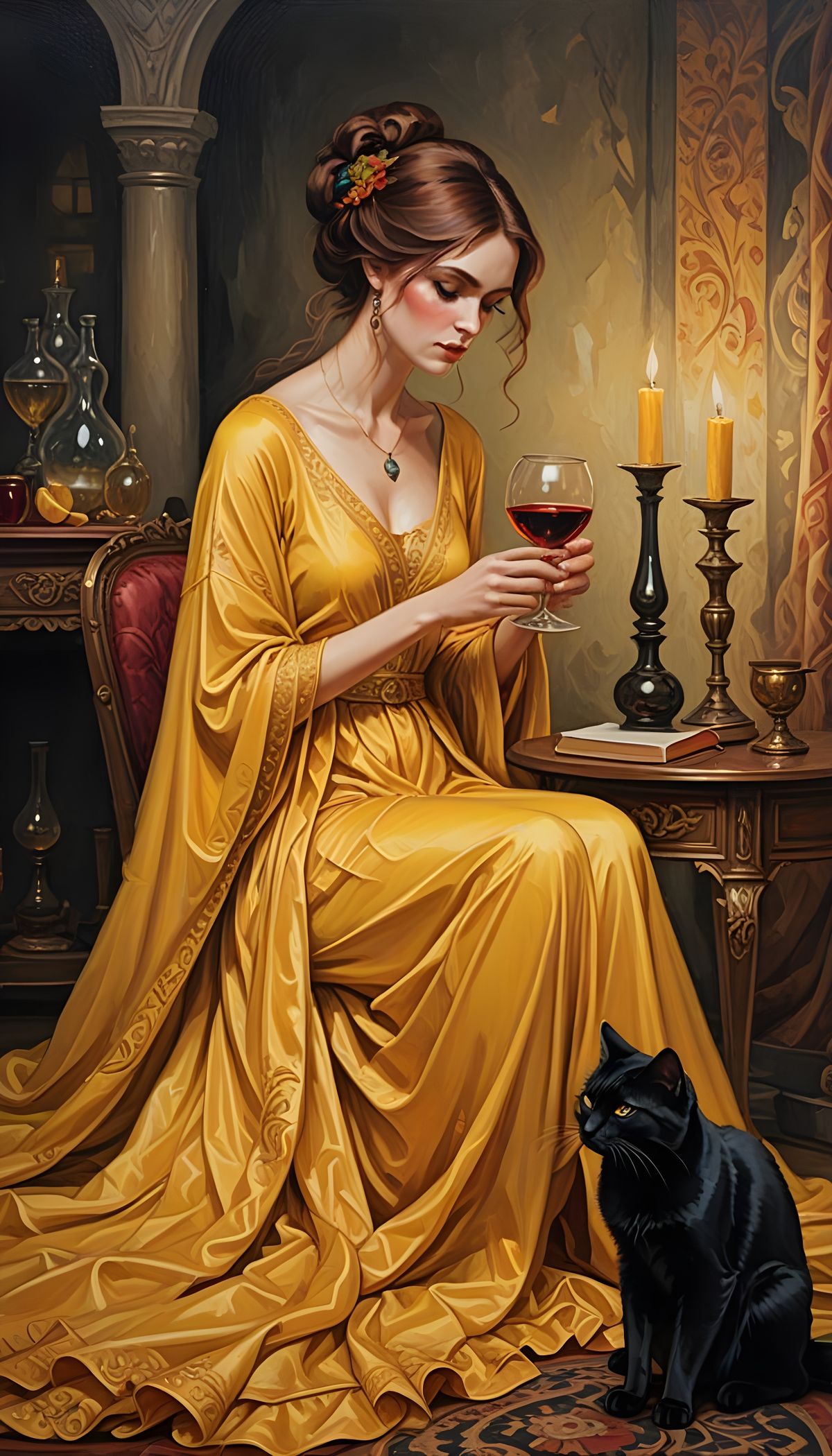 A serene oil painting of a woman in a yellow dress, surrounded by mystic symbols, with a black cat by her side, as she gazes into a potion, evoking a sense of mysticism and ancient wisdom.
