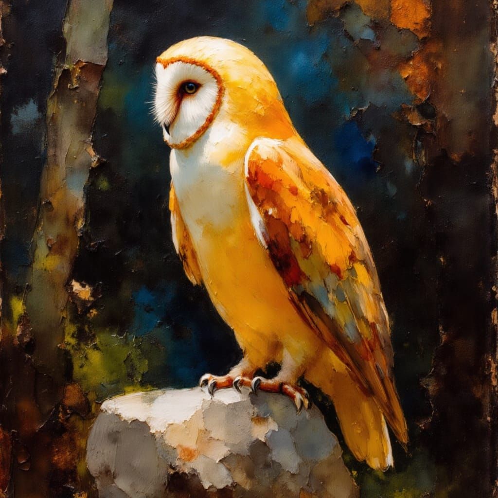 This image shows a stylized owl perched on a rock at night. The owl is rendered with autumn colors in a painterly style, evocative of classic figurative art.