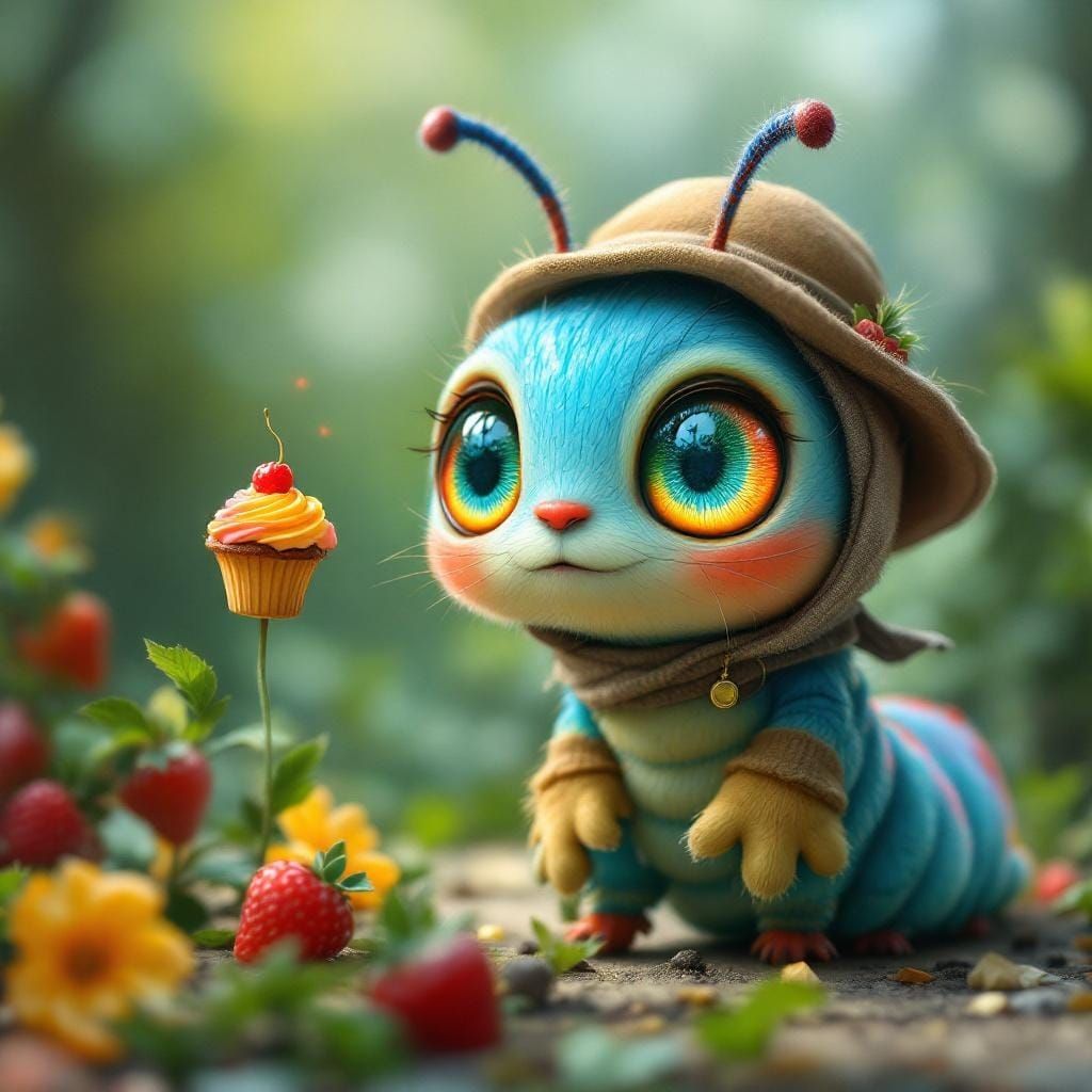 A charming image of a multicolored caterpillar wearing a gardener's hat and gloves. It shows the caterpillar's excited expression as it discovers a colorful fruit cupcake, in a detailed matte painting style.
