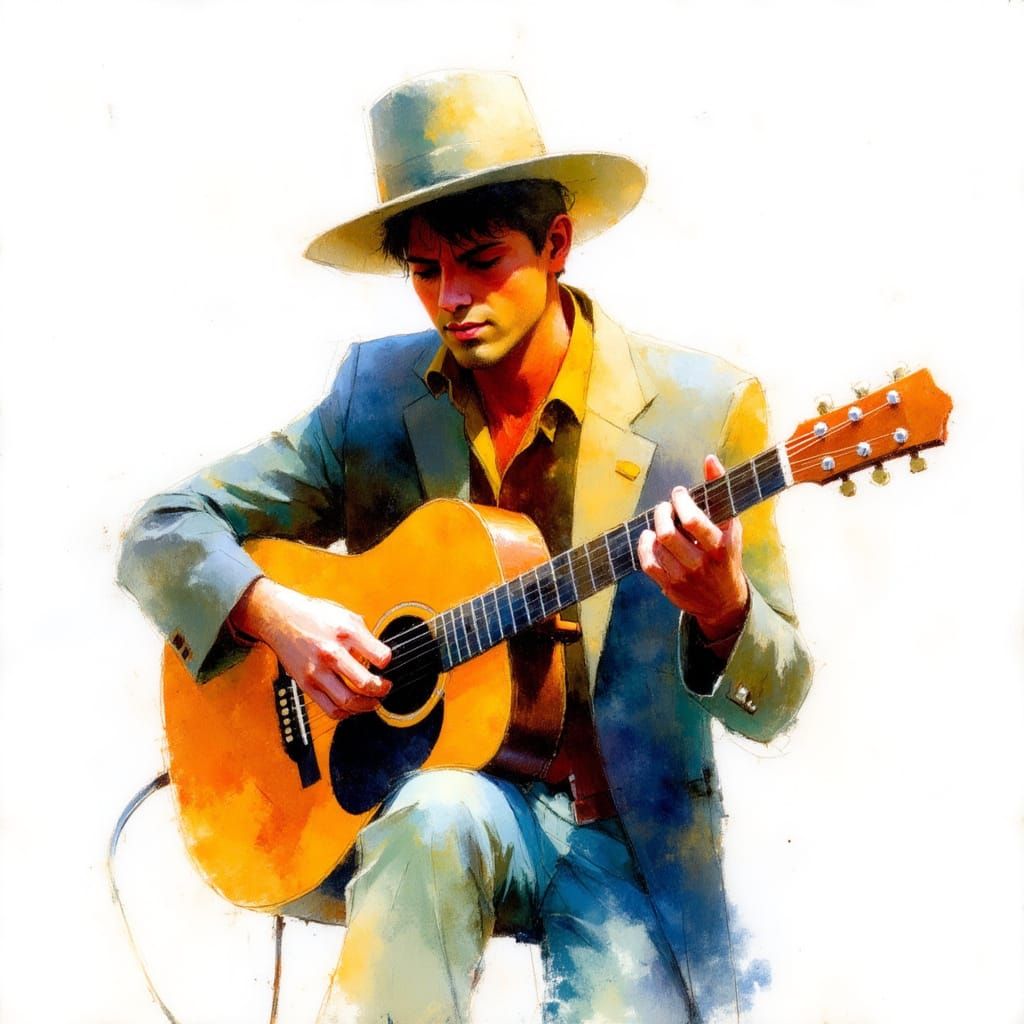 This image is a captivating double exposure of a guitarist on a white background, blending impressionistic and realistic elements in a watercolor style reminiscent of intricate, hyper-detailed concept art