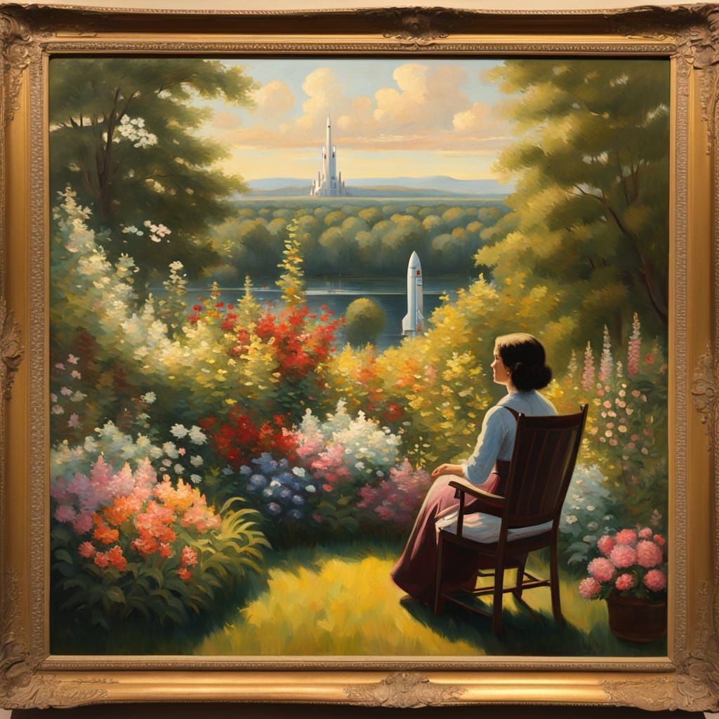 This serene painting depicts a woman sitting in a tranquil garden, surrounded by vibrant flowers and a majestic space rocket on the launching pad in the background, bathed in warm sunlight and captured in exquisite detail.