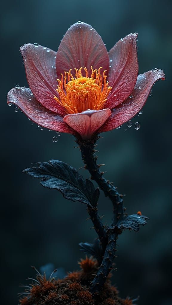 A surreal image of an alien flower with petals like molten glass. The flower features black bat fractals, coral lace spores, and bioluminescent stamens, set against a storm-lit background.