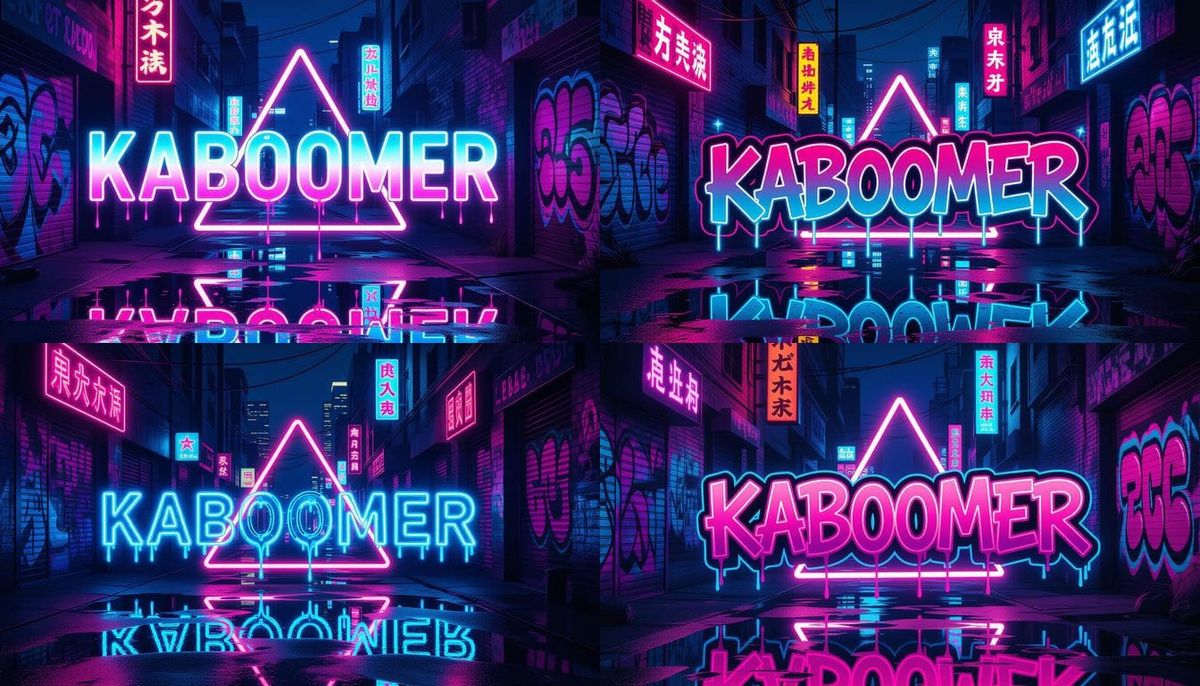 This image shows the word "KABOOMER" in vibrant pink and blue bioluminescent neon paint. The neon outlined word sits in an urban alleyway with reflections on the wet ground, in synthwave neon retro style.