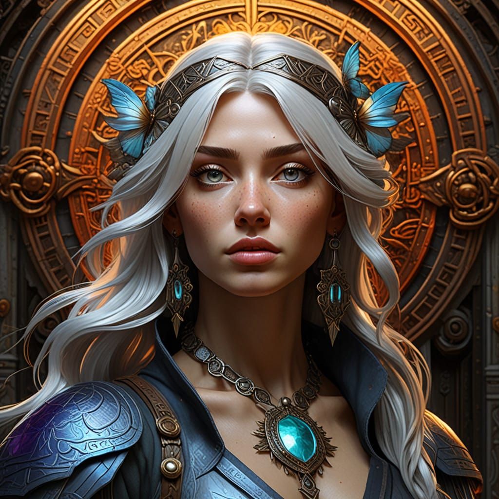 A stunning, hyper-detailed image of a Fae warrior, set against a dark, cinematic backdrop, with intricate textures and a vibrant color palette, blending traditional and digital art styles, reminiscent of Pixar and Disney concept art.