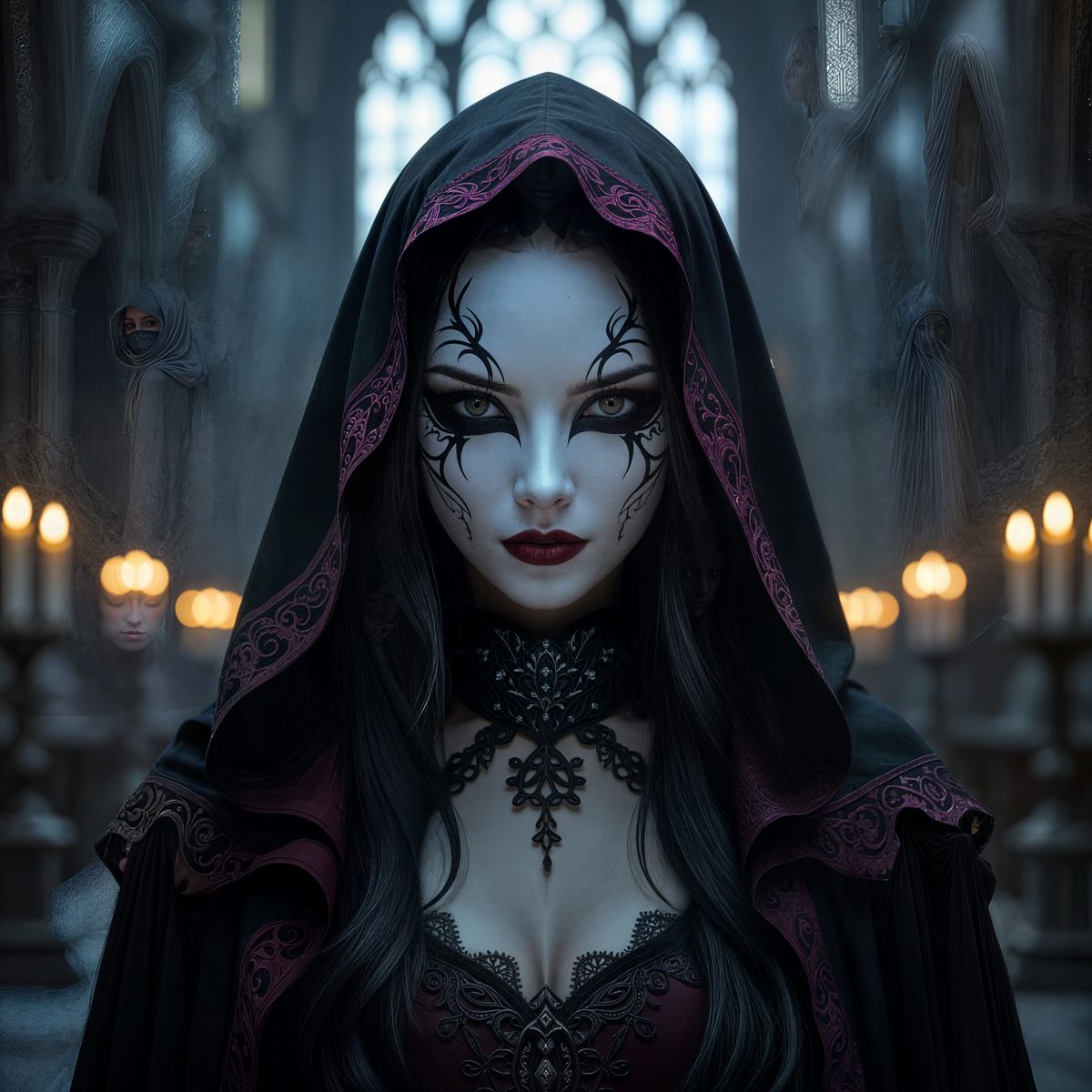 This image shows a young woman wearing a serene white mask in a dark magic battle. The cinematic scene, set in an ancient cathedral, is reminiscent of dark fantasy art with cinematic lighting and film grain.