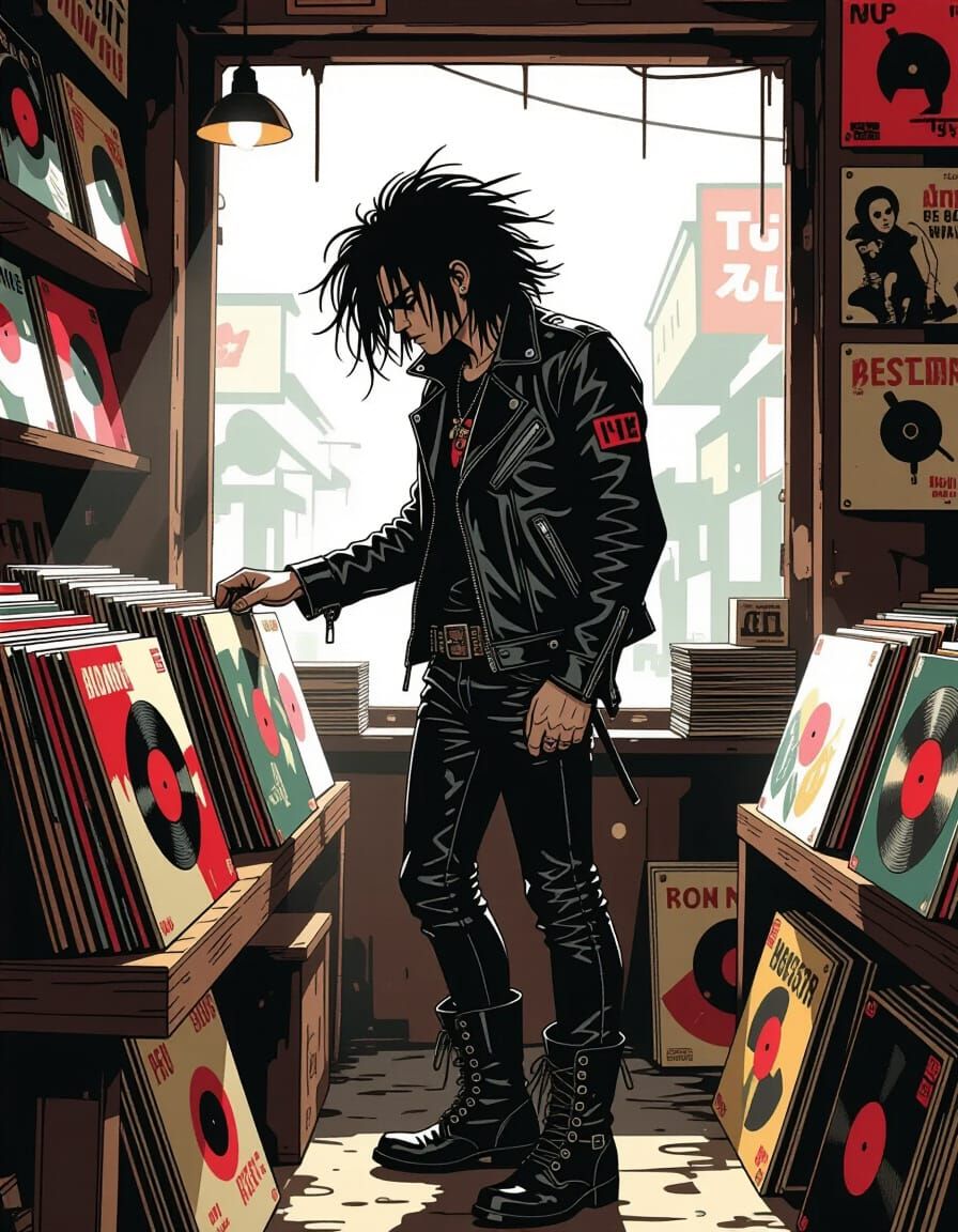 This image shows a young punk man in a vintage record store, searching for vinyl. Rendered in a gritty urban art style with a desaturated palette and red accents.