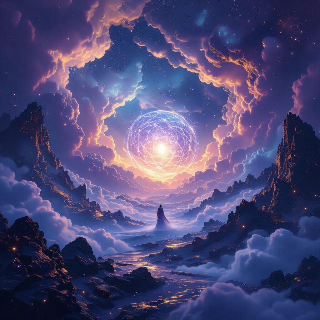 This image showcases a futuristic surreal dreamscape emerging from darkness, featuring vibrant purple, blue, and gold swirls, translucent clouds, and shimmering dust. Rendered with cinematic lighting and volumetric fog for an immersive, high-resolution effect.