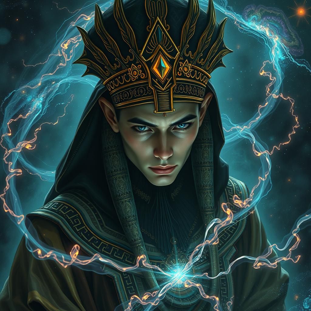 A dramatic dark fantasy portrait of a figure in Egyptian-style robes, caught in a cosmic time warp. The artwork features swirling galaxies and ethereal energy, with a surreal and intricate aesthetic.