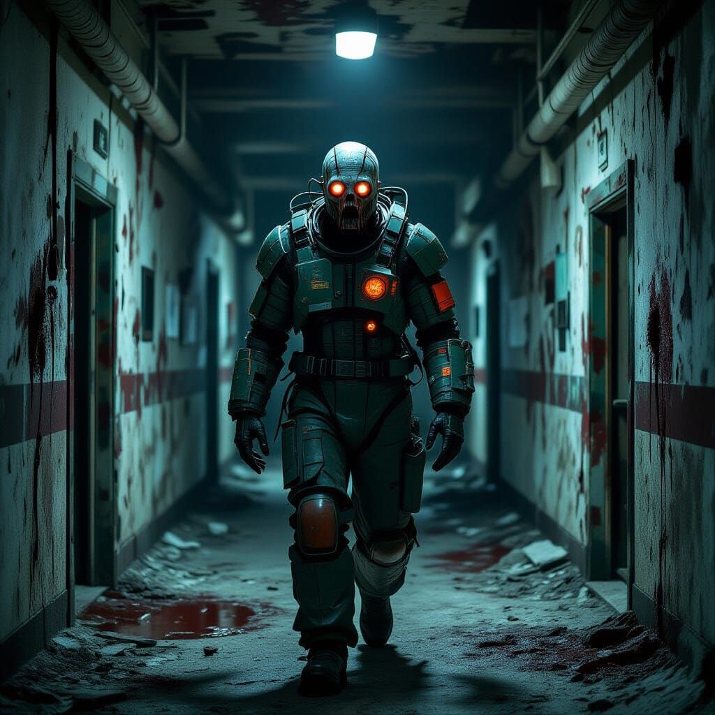 This image shows a mutated monster in a radioactive suit walking through a dark, decaying corridor. The creature is surrounded by peeling walls and decaying machinery in a hyperrealistic and ominous style.