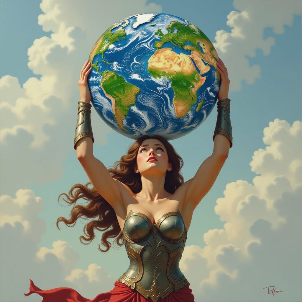 A striking picture of a titan struggling to lift a stone world. The image is a highly detailed fantasy art piece in the style of an oil painting.
