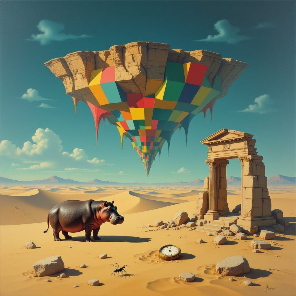 This hyperrealistic oil painting depicts a desolate beach with a giant floating rock formation. Vibrant geometric shapes melt over dunes, near an elongated hippo and a melting clock, in a dreamlike atmosphere.