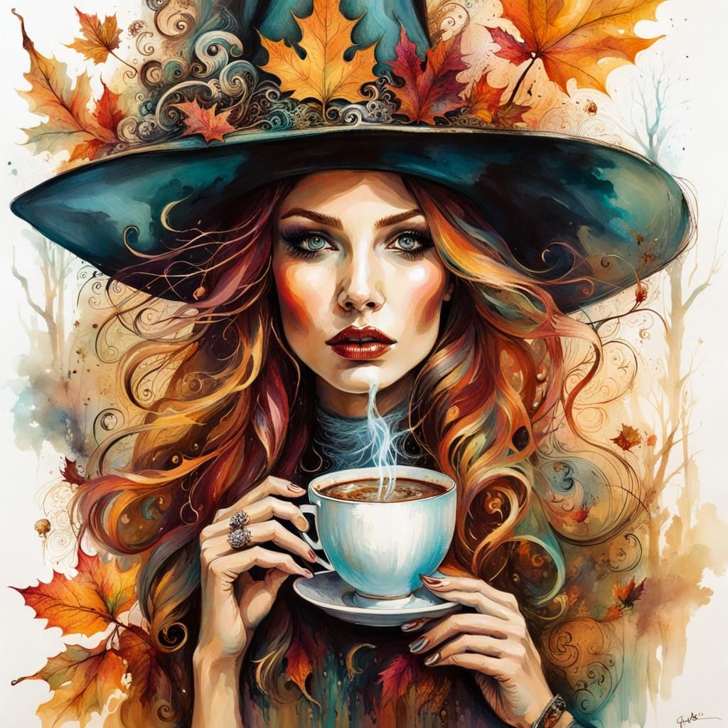 This image depicts a surrealistic ancient autumn witch enjoying coffee amidst a dreamscape filled with eldritch horrors. The artwork features vibrant macabre colors and intricate details in a symbolic style.