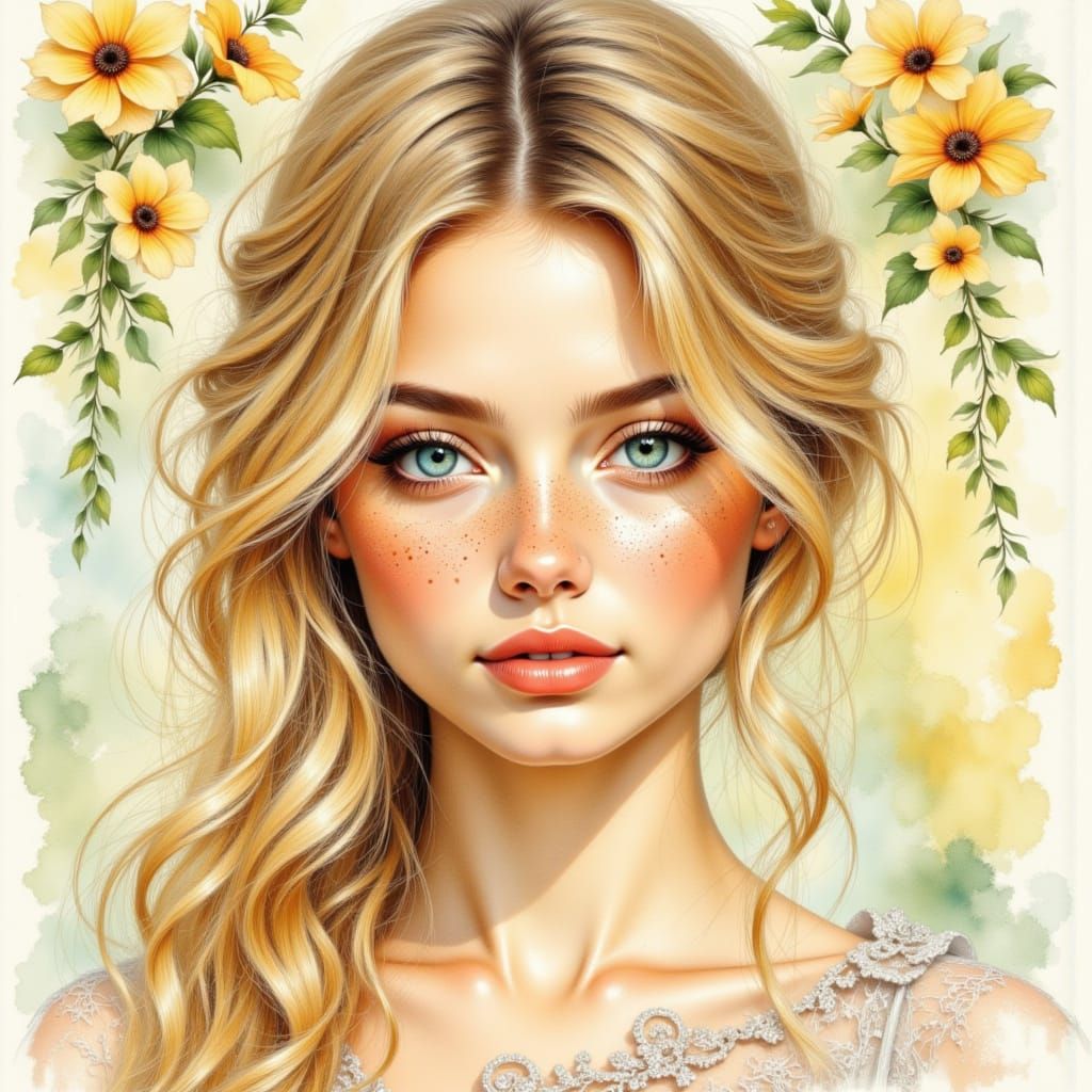 This image shows a gorgeous, busty woman with flowing blonde hair and blue-green eyes, sketched with delicate features and freckles. It blends detailed pencil art with soft watercolor washes in a dreamy, romantic woodland setting.
